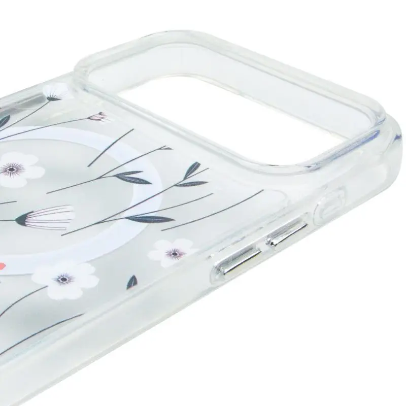 TPU+PC чехол Clear Garden with MagSafe для Apple iPhone Стильный прозрачный чехол с цветочным дизайном изготовлен из сочетания прочного поликарбоната и эластичного TPU. Обеспечивает надежную защиту от царапин, ушибов и ежедневного износа, не скрывая дизайн смартфона. Встроенное MagSafe-кольцо гарантирует совместимость с беспроводной зарядкой и магнитными аксессуарами. Поднятые бортики защищают экран и камеру, а точные вырезы обеспечивают полный доступ к кнопкам и портам. Достоинства: • Прозрачный корпус с нежным цветочным принтом • Двойной материал: TPU+PC • Поддержка MagSafe • Защита от падений и царапин • Плотное прилегание без скольжения
