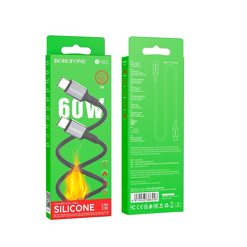Кабель Borofone BX83 Famous Silicone Type-C to Type-C 60W/1m Black Кабель BOROFONE BX83 Famous Type-C to Type-C – это стильный и функциональный кабель в мягкой оплетке из огнестойкого силикона, предназначенный для эффективной зарядки, синхронизации и передачи данных между устройствами. Мощность 60 Вт и ток 3 A оптимизированы для поддержания быстрой зарядки ваших девайсов. Такие технические характеристики в сочетании с соответствующим адаптером или повербанком позволят использовать его для подзарядки ноутбука с напряжением 20 В при силе тока 3A и смартфонов или планшетов с максимальной силой тока 3A. Кабель обеспечивает надежную и стабильную передачу данных между устройствами, а малый вес и компактный дизайн делают его удобным для переноски и использования в дороге. Силиконовая оплетка не только придает кабелю стильный вид, но и укрепляет его, делая более устойчивым к износу и предотвращая запутывание. Коннекторы из алюминиевого сплава устойчивы к коррозии и механическим повреждениям, благодаря чему обеспечивается длительный срок службы.