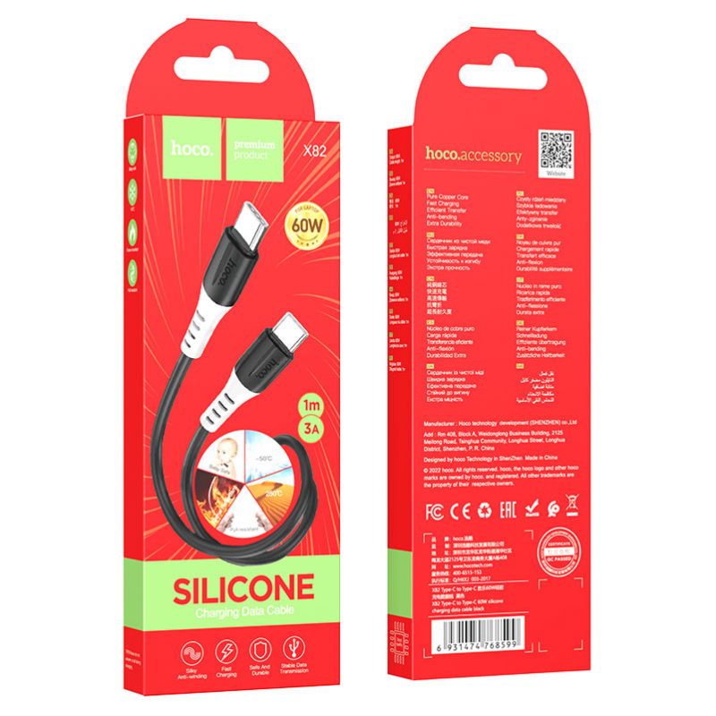 Кабель Hoco X82 Silicone Type-C to Type-C 60W Black 1m
