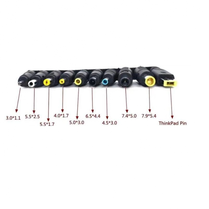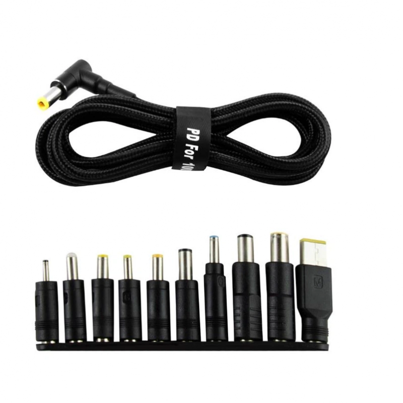 Кабель питания ноутбука с набором переходников 100W - Кабель питания для ноутбука с набором переходников из Type-C на DC (10 in 1) - Этот набор адаптеров-переходников предназначен для совместимости между разными моделями ноутбуков, роутеров и других устройств с питанием DC 5.5x2.1 мм. - в комплект входит 10 переходников, каждый из которых предназначен для конкретного типа устройства – Этот набор является идеальным решением для питания ноутбука или роутера от павербанка при отключении света. - максимальная мощность 100W - длина кабеля: 1 метр