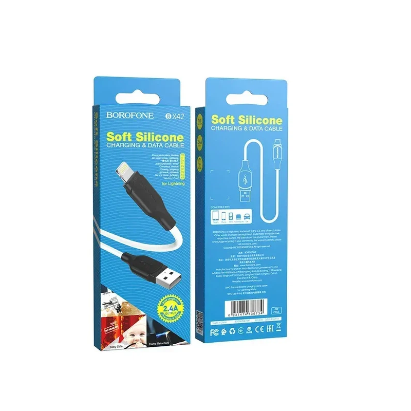 Borofone BX42 – это надежный кабель для ежедневного использования, главной особенностью которого является материал оплетки. Использование пищевого силикона делает этот кабель невероятно приятным на ощупь, очень гибким и устойчивым к любым температурным перепадам. Ключевые преимущества: Эластичность и Soft-touch эффект: Кабель очень мягкий, он не запоминает форму изгиба, не путается и мгновенно расправляется. Термостойкость: Силиконовое покрытие выдерживает экстремальные температуры (от -50 до +250°C), поэтому кабель не дубеет на морозе и не плавится при перегреве. Безопасная зарядка: Поддерживает стабильную силу тока до 2.4А, что обеспечивает оптимальную скорость зарядки для iPhone, iPad и AirPods без ущерба для аккумулятора. Прочность на разрыв: Несмотря на свою мягкость, кабель имеет усиленный внутренний сердечник, что позволяет ему выдерживать растяжение и активное ежедневное использование. Чистый белый дизайн: Лаконичное исполнение в белом идеально дополняет оригинальный стиль техники Apple.