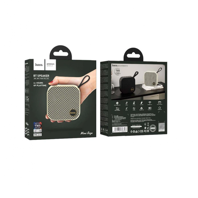 Портативная колонка Hoco HC22 Auspicious Sports в белом цвете сочетает стильный дизайн с качественным звуком. Ее уникальная квадратная форма не только привлекает внимание, но удобна в использовании в движении. Колонка оснащена мощным динамиком диаметром 52 мм и обеспечивает четкое и насыщенное звучание музыки. Функция TWS позволяет объединить несколько столбцов для создания мощной звуковой системы. Разнообразие режимов воспроизведения, включая Bluetooth, FM, MicroSD-карту, USB и AUX, гарантирует приятное восприятие музыки в любой ситуации. Емкий аккумулятор позволяет слушать музыку до 4 часов, а быстрая зарядка за 2 часа минимизирует ожидание. IPX5 защита от влаги и пыли обеспечивает долговечность изделия. Колонка имеет удобный шнурок для транспортировки, позволяет управлять треками и громкостью с помощью кнопок на корпусе или синхронизировать с устройствами через Bluetooth. Есть возможность воспроизведения аудиофайлов из внешних устройств через разные интерфейсы. Обладает всеми необходимыми характеристиками для комфортного использования. Комплект поставки включает в себя саму колонку, кабели USB и AUX, а также упаковку.