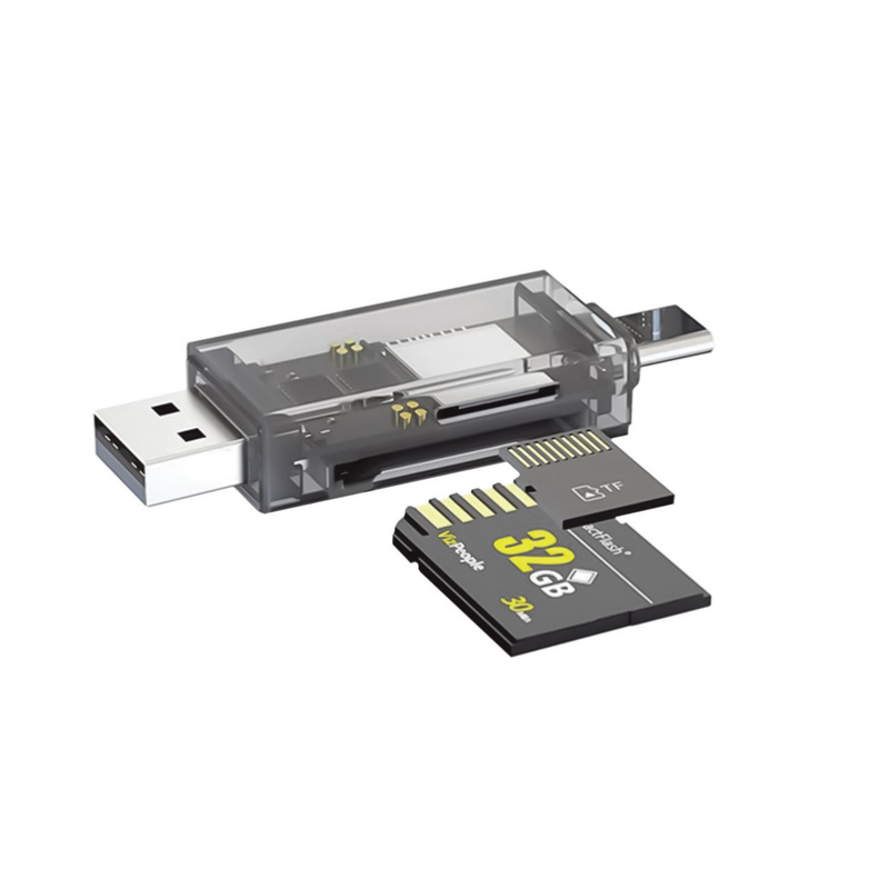 Считыватель карт WALKER WCD-72 microSD/SD (output USB2.0, Type-C) Tranbsperent Устройство для чтения карт памяти, подключаемое к ПК или ноутбуку с помощью USB. Кардридер передает информацию с карты на компьютер для просмотра или изменения и работает как обычная флешка. По виду картридер может быть разным, но чаще всего является небольшой коробочкой со слотами для размещения карт всех существующих форматов: больших SD, используемых в фотоаппаратах и microSD, используемых в мобильной цифровой технике малого размера. При выборе картридера обязательно обратите внимание на форматы карт памяти, поддерживаемые данным аксессуаром.