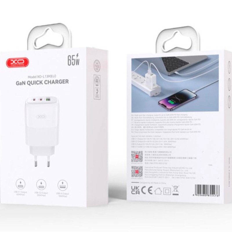 Сетевое зарядное устройство XO L139 45W USB-A + 65W/2 USB-C White+ Type-C Cable