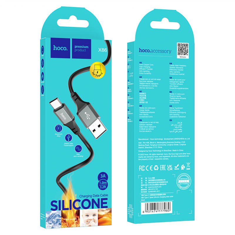 Кабель Hoco X86 Spear USB to Type-C Black (1m) — це надійний аксесуар для швидкої зарядки та синхронізації даних, головною особливістю якого є використання харчового силікону для зовнішнього обплетення. Ключові характеристики Згідно з офіційними даними виробника Hocotech.com: Максимальний струм: Підтримує силу струму до 3A, що дозволяє використовувати його для швидкої зарядки смартфонів та планшетів. Матеріали: Обплетення виконане з м'якого та еластичного силікону, а корпуси конекторів — з міцного алюмінієвого сплаву. Конструкція сердечника: Складається з 112 мідних дротів , що забезпечує стабільну передачу енергії. Фізичні параметри: Довжина становить 1 метр, вага — лише 24 грами Переваги моделі Стійкість до температур: Силіконове покриття зберігає еластичність навіть при низьких температурах і не деформується при нагріванні. Захист від заплутування: Завдяки софт-тач покриттю кабель практично не сплутується і стійкий до перегинів. Універсальність: Підходить для всіх пристроїв з роз'ємом Type-C (Android-смартфони, навушники, повербанки тощо) для зарядки та передачі файлів.