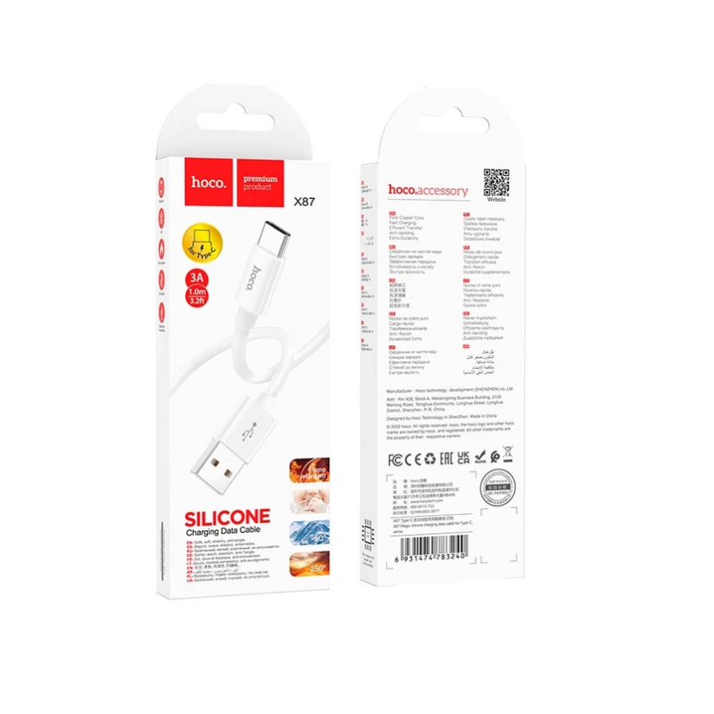Кабель Hoco X87 Magic Silicone 3A USB Type-C Cable відноситься до категорії шнури зарядні, для швидкої зарядки, синхро-зарядні. Він ідеально підходить для телефонів, для планшетів, якщо необхідно підключити ваш гаджет і десктоп або лептоп. Але це не означає, що у вас не вийде підключити USB-шнур до іншої техніки, за наявності відповідних портів це не потягне за собою ніяких проблем. Крім того, він практично незамінний для зарядки акумулятора. Тип виходів Від конструкції виходу залежить сумісність дроту з різною технікою, тому цей параметр потрібно обов'язково врахувати при виборі аксесуара. USB-провід Hoco X87 Magic Silicone 3A USB Type-C Cable оснащений роз'ємами Type C, USB - Type C. USB Type-C – конектор із дзеркальною розпіновкою, тому підключити його неправильно неможливо. І це не єдина його перевага. Type-C провід забезпечує передачу даних на швидкості до 10 Гб/с, і витримує велику потужність струму. Якісні дроти цього типу можна використовувати для зарядки не тільки портативних пристроїв, але і лептопів, сумісних з технологією швидкої зарядки Power Delivery. Тому не дивно, що USB-C активно замінює порт Micro-USB.