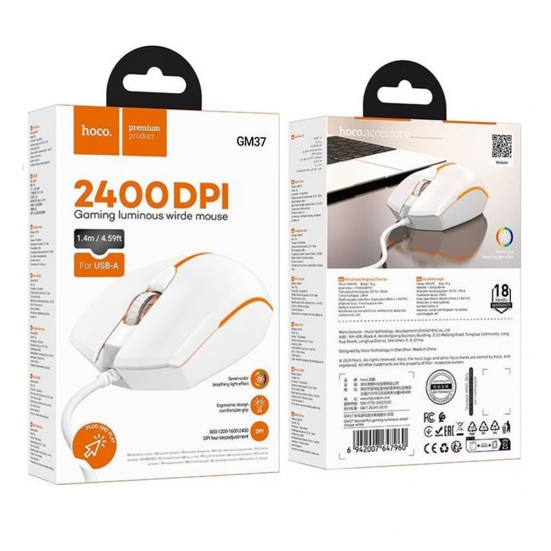 RGB-світловий дизайн Динамічна система RGB-підсвічування надає вашій конфігурації сміливої ігрової естетики. Незалежно від того, чи ви транслюєте відео, змагаєтесь чи просто граєте заради розваги, Hoco GM37 освітлюватиме ваш стіл з кожним рухом. Висока точність роботи Насолоджуйтесь плавним і точним відстеженням у FPS, RPG та MMO іграх. Розроблено для серйозних геймерів, яким потрібна надійна продуктивність та швидке керування. Ергономічний дротовий дизайн Підключи та працюй Не потрібне програмне забезпечення — просто підключіть його до USB-порту та почніть грати. Ідеально підходить для геймерів, які хочуть миттєвої гри без складного налаштування.