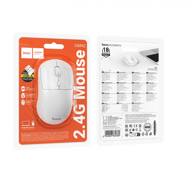 Wireless миша Hoco GM42 Platino пропонує гармонійне поєднання стильного мінімалістичного дизайну та впевненої бездротової роботи у повсякденних умовах. Завдяки точному сенсору та ергономічній формі, вона забезпечує плавне та точне керування, підвищуючи комфорт та ефективність при тривалій роботі за комп'ютером вдома або в офісі. Особливості та переваги бездротової миші Hoco GM42 Platino: Мінімалістичний дизайн з плавними вигинами обтічної форми та практичними панелями основних кнопок. • Невеликі розміри (110×59×36мм) та вага (46г) – забезпечують комфорт, створюючи мінімальне навантаження при тривалому використанні. • Якісні електронні компоненти та міцний корпус з ABS-пластику з приємною на дотик матовою поверхнею. • Ергономічна симетрична форма, яка забезпечує зручний хват будь-яким звичним способом та будь-якою рукою. • 2 стандартні кнопки (ліва та права), кнопка для зміни DPI та ребристе колесо вертикального прокручування. • Стійкі до зношування перемикачі основних кнопок, які відрізняються миттєвим відгуком та збільшеним ресурсом натискань. • Стабільне бездротове з'єднання, яке здійснюється на часте 2.4GHz за допомогою компактного USB адаптера. • Сучасний оптичний сенсор, який точно та швидко відстежує пересування з роздільною здатністю 800, 1200 та 1600DPI. • Простота обслуговування та тривалий час роботи від батарейки стандарту AA. • Слот для зберігання комплектного адаптера USB 2.4G під кришкою відсіку для батарей. • Підтримка технології Plug and Play та сумісність із більшістю сучасних ОС. Бездротова миша Hoco GM42 Platino створена як практичний інструмент для роботи, навчання та розваг, де важливі точність, зручність та надійність.