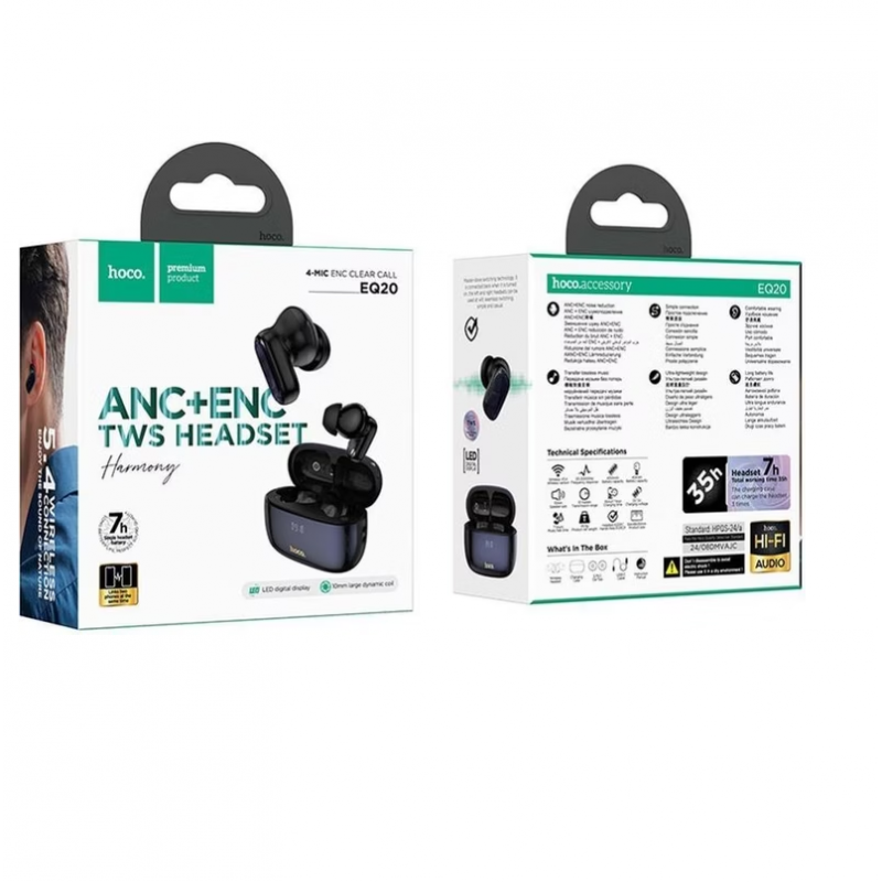 Hoco EQ20 – це сучасні бездротові стереонавушники True Wireless Stereo (TWS) з передовими технологіями асинхронного шумозаглушення (ANC) та шумозаглушення навколишнього середовища (ENC). Завдяки технології Bluetooth 5.4 вони забезпечують стабільне з’єднання та високу якість звуку. Удосконалені функції шумозаглушення ANC та ENC дозволяють користувачам насолоджуватися чистим звуком навіть у галасливому середовищі. Їхній ергономічний дизайн та легка конструкція забезпечують комфортне використання протягом тривалого часу. Зарядний футляр з портом USB-C забезпечує швидку зарядку, а також підтримує активацію голосового помічника та можливість одночасного підключення до двох пристроїв, розширюючи функціональність навушників.
