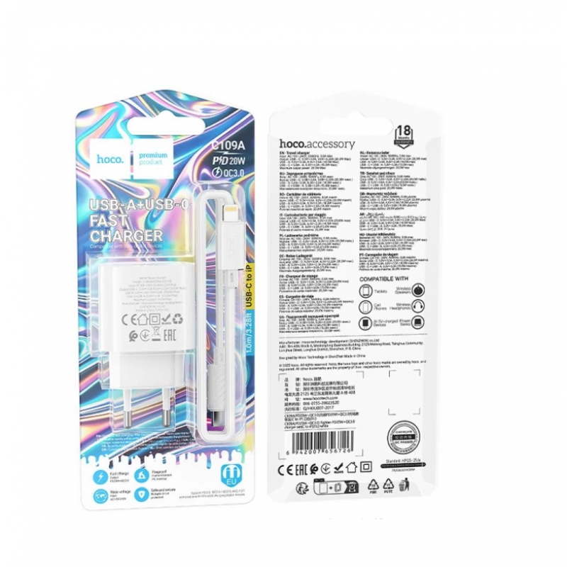 Hoco C109A Fighter RD — це потужне та безпечне рішення для швидкої зарядки ваших пристроїв Apple. Комплект складається з компактного адаптера з портом Type-C та міцного кабелю Type-C to Lightning. Завдяки підтримці протоколу Power Delivery (PD) 20W, цей набір здатний зарядити iPhone до 50% всього за 30 хвилин. Ключові переваги: Висока потужність 20 Вт: Спеціально розроблено для швидкої зарядки серій iPhone 8–14, а також сумісних моделей iPad. Повний комплект: Ви отримуєте готове рішення — блок живлення та кабель, що ідеально підходять один до одного. Інтелектуальний захист: Вбудована система безпеки захищає ваш гаджет від стрибків напруги, перевантаження струмом, короткого замикання та перегріву. Стандарт PD 3.0: Підтримка Power Delivery забезпечує максимально ефективну та безпечну передачу енергії, подовжуючи термін служби акумулятора. Преміальний дизайн: Корпус виготовлений з вогнестійкого полікарбонату (PC) з глянцевим фінішем, що виглядає стильно та сучасно.